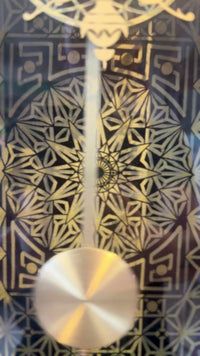 Finished in a deep black with warm metallic gold detailing, the surface is adorned with intricate geometric and ornamental patterns that create depth, symmetry, and visual rhythm. The clock face features a radiant, mandala-like design, evoking celestial charts and classical engravings, while remaining clean and legible.