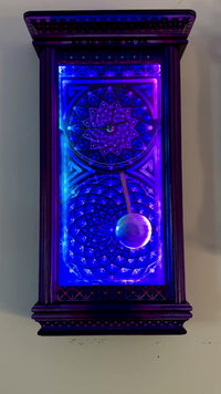 The clock features a bold, rich purple backdrop, hand-painted with intricate patterns that create a stunning visual contrast. The elegant pendulum swings gracefully, adding a soothing, rhythmic motion to the piece. But what sets this clock apart is the integrated lighting system—powered by Space Cadets Lighting—that allows you to customize the ambiance in your space with the touch of a button. Whether you want soft, ambient lighting for relaxation or vibrant hues to match your mood, the lighting kit offers a range of color options and brightness levels to suit any occasion.
